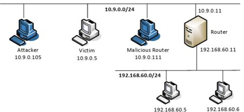 • Malicious Router/Attacker (10.9.0.111): The node attempting to intercept traffic.